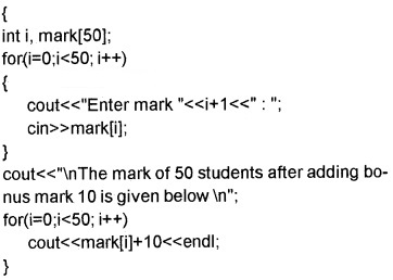 Total mark of 50 students in a class are given in an array. A bonus of 10 marks is awarded to all of them. Write the program code for making such a modification.
