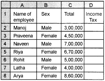 =IF (C2 = “MALE”, (D2-20Q000)*20%, IF (AND(C2 = “FEMALE”, D2<=500000), (D2 – 300000) * 20%, (D2-250000)*20%))