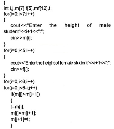 Collect the heights of 12 students from your class in which 7 students are male and others are female students. Suppose these male and female students be seated in two separate benches and you are given a place which is used for sitting these 12 students in linear form. How will you combine and make them sit without mixing male/female students? Write a program for the same.