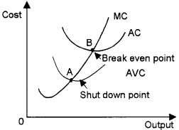 2. Break down point shows a situation where a firm earns no profit or no loss. It is the point where AR = AC. Shut down point shows a situation where a firm is compelled to stop the production since it is not able to cover its variable cost. This is the situation where the firm’s P > AVC.