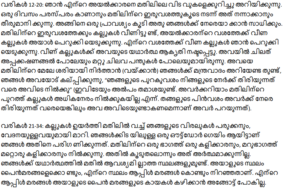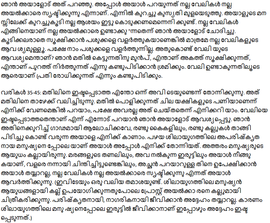 By lifting the stones and placing them on the wall our fingers become rough and painful. Consider it an outdoor game between us, one player standing on one side of the wall and the other standing on the other side. It means nothing more than that. There are also places where we do not actually need a wall. His area is covered with pine trees and my area is full of apple trees. My apple trees will never go to his area to eat the cones of his pines. I tell him that. But then he tells me that it is good fences that make god neighbours. Mischief grows in me and I want to put some better idea into his mind. So I ask him how good fences can make good neighbours. Good fences are okay if we were growing cows to prevent them from getting mixed up. But here we do not rear cows. So what is the need for a fence? Before I built a wall I would try to find out what I was keeping in and what I was keeping out and whom I would offend by making the wall.