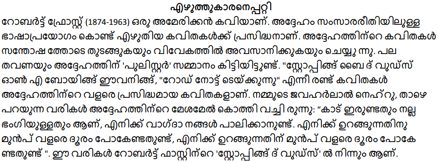 Robert Frost (1874-1963) is an American poet. He is well-known for his poems which are in a colloquial style. His poems begin in delight and end in wisdom. He has received the Pulitzer Prize a number of times. “Stopping by the Woods on a Snowing Evening” and ‘Road Not Taken” are two of his most famous poems. Our Jawaharlal Nehru had these lines inscribed and kept on his table: “The woods are lovely dark and deep, And I have promises to keep, And miles to go before I sleep, And miles to go before I sleep.” These lines are from ‘Stopping the Woods….” by Robert Frost.