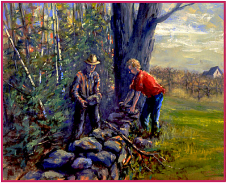 It seems there is something that does not like a wall. It wants the wall pulled down. I would say it was elves that wanted the wall to be broken. But I know it is not elves that did it. I wanted him to tell me what it is that did not like the wall. As I contemplate like this I can see him carrying two stones holding them firmly in each hand. To me he looked like an uncivilized man from the Old Stone Age Era, whose weapon was stone. He is moving in the darkness of trees and their shade. He is not yet ready to give up his father’s saying although he has thought about it so well. Once again he repeats that good fences make good neighbours. (Reft also there is great fun. Frost pictures the neighbour with the stones as a Stone Age man using stones as his weapon. He is not ready to become civilized as he still wants to live in the darkness of the Stone Age.)