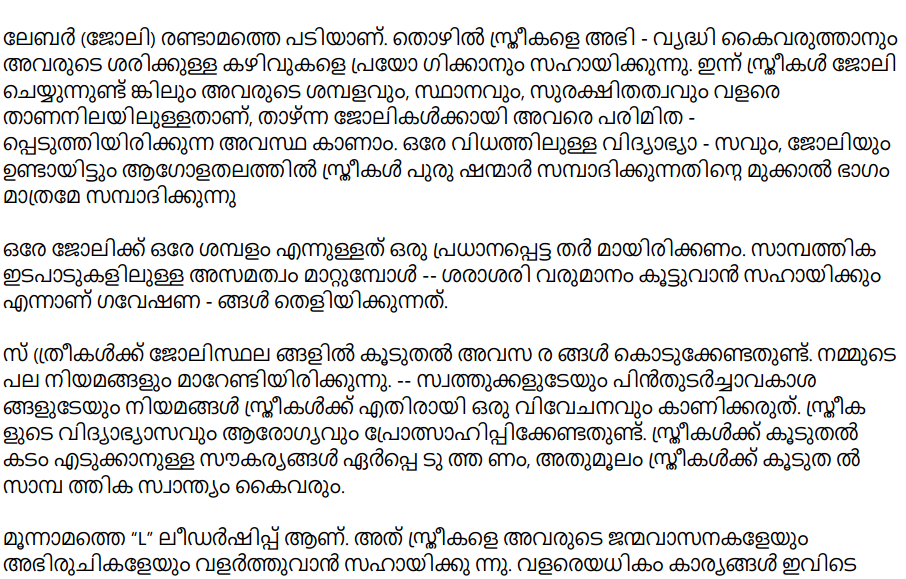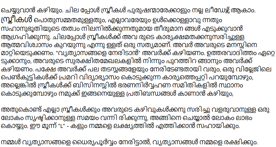The 3 Ls are important in liberating a woman. Education makes her conscious of her rights and responsibilities. Labour helps her to earn money and also contribute to the economic development of the nation. Women are sometimes better leaders because they tend to make decisions based on consensus-building, inclusion, compassion and sustainability. Men tend to be rash, whereas women are supposed to be more sober.