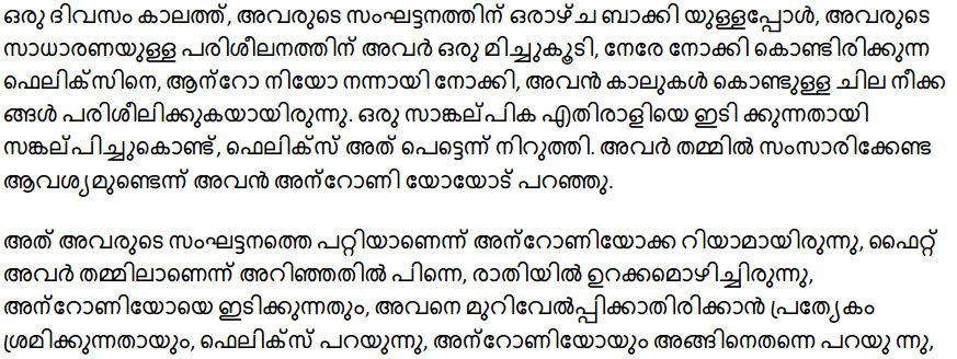 Page 41: One morning, less than a week before their bout, they met as usual for their workout. Antonio glanced at Felix who kept his eyes straight ahead. He was practising some leg movements and hitting an imaginary jaw. Felix suddenly stopped and told Antonio that they must speak to eaGh other.