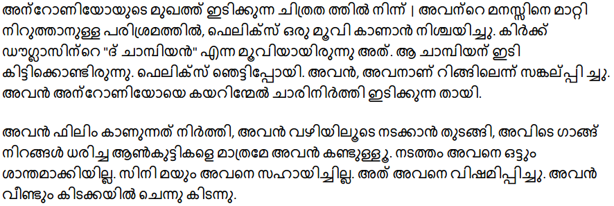 Page 42: Felix decided towatch a movie in an effort to keep Antonio’s face away from his mind and fists. The film was The Champion’, acted by Kirk Douglas. The champion was getting beaten. Felix got a shock. He imagined himself in the ring, blasting Antonio against the ropes.