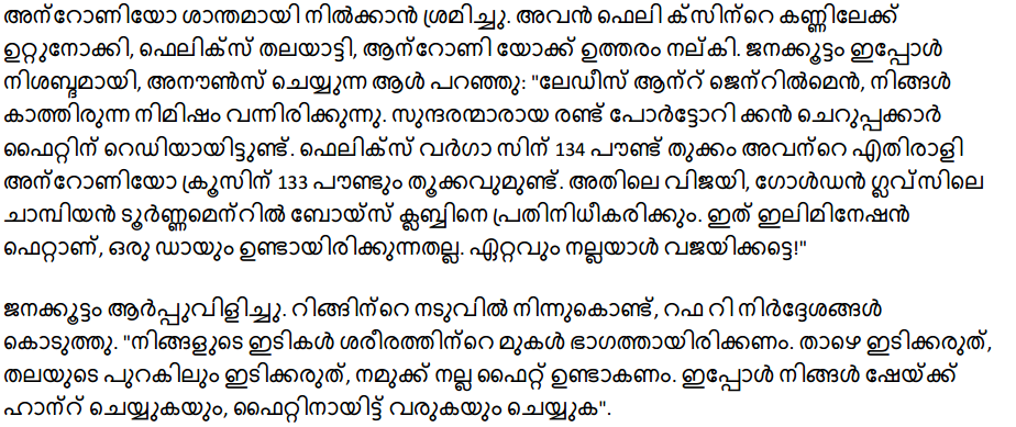Page 44: The second round began. Felix was off his stool and rushed to Antonio like a bull. Antonio fought back well. Neither fighter was giving an inch. Suddenly Felix hit Antonio on the chin. Antonio’s legs turned jelly and his arms flailed out desperately. Suddenly his head cleared and hit Felix on the bridge of his nose. The crowd was roaring at each punch. Soon the second round came to an end.