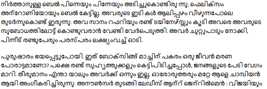 They exercised sometimes at the Boys’ Club and sometimes at the gym. After a series of elimination bouts, they were told they were to meet each other in the division finals. The day was fixed for 7 August. They both wanted to win. They talk about it. Then Felix makes a suggestion that they will not see each other until the day of the fight. After the fight they will get together again as if nothing happened. They continue training hard.