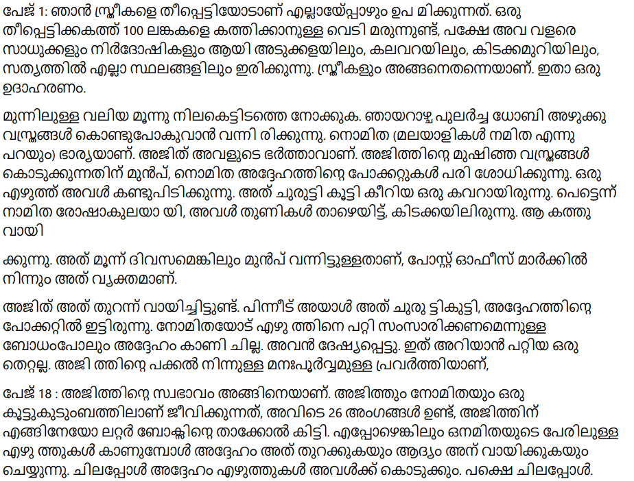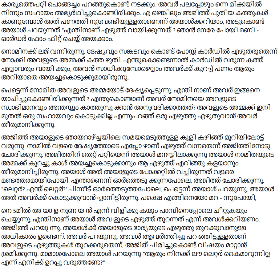 Page 18: Ajit’s nature is like that. Ajit and Nomita live in a joint family. There are 26 people there. Ajit somehow got the key to the letter box. Whenever he finds a letter addressed to Nomita, he opens it and reads it first. Sometimes he gives the letter to her but sometimes he does not. That is what Nomita thinks. So far Ajit has not discovered any letter that is even slightly suspicious. But his ugly habit will not go. She tried many things to make him stop reading her letter. She showed anger, took offense, tried to shame him and used sarcasm. Nothing worked. He just laughs it away. Sometimes he scolds her.