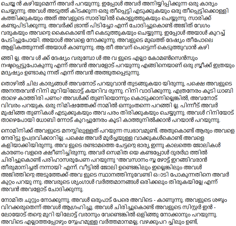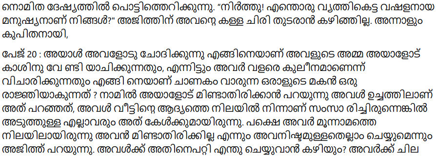 Page 20: He asks her how could her mother go on begging for money from him and still think they are high-class people. How can a dung-picker’s daughter be a queen? Nomita asks him to shut up. She spoke so loudly that everybody nearby would hear her if she was speaking from the ground floor. But they were on the 3rd floor. Ajit says he won’t shut up and will do what he wants. What can she do about it? She says she can do something. She now does something quite astonishing. She picks up a matchbox lying near and lights a matchstick and touches it to her sari. The sari flares up. Asking if she has gone mad, Ajit comes rushing and puts out the fire using his hands. Now he is a little afraid. He looks at her and he sees fire burning, blazing on her face. He can’t easily put out that fire. He tells her that she loses all common sense when she is angry. How could a woman be so angry!