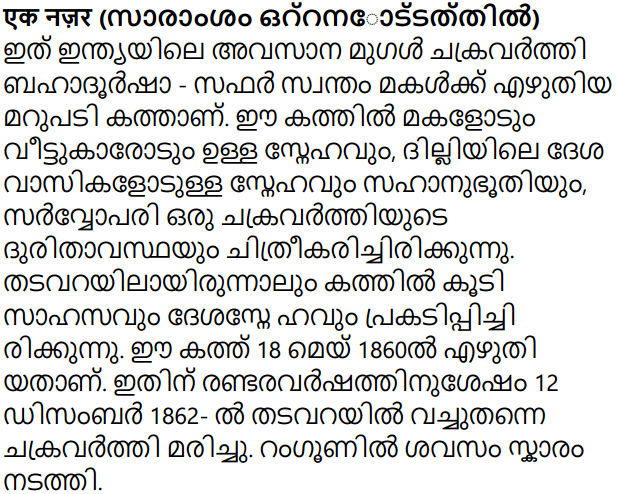 हमारे बारहवी कक्षा के हिंदी पाठ्यपुस्तक में पहला स्वतन्त्रता संग्राम के समय भारत के बादशाह बहादुर शा जफर का एक खत है। यह खत पढ़कर मुझे बहुत दुःख हुआ, साथों साथ अभिमान भी। क्योंकि हजारों की कुर्बानी की कथा हमारे स्वतंत्रता के पीछे हैं। आज हमारे पीढ़ी में इस विचार नहीं है कि कितने व्यक्तियों के कठिन परिश्रम के कारण ही हमें आज़ादी मिली हैं। हमें ज़रूर इस बात पर ध्यान देना चाहिए। क्योंकि कल के प्रयत्न का फल ही हम भोग रहे हैं। मुझे बहुत खुशी हैं कि यह बात तुमसे बताकर । तुम्हारे मित्रों को भी इसके बारे में ज़रूर बताना। हो सके तो इसी प्रकार के कहानियाँ और घटनाओं को पढ़ना भी। खत समाप्त करता हूँ। जरूर जवाब लिखना।