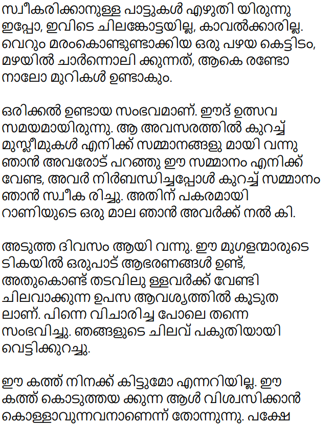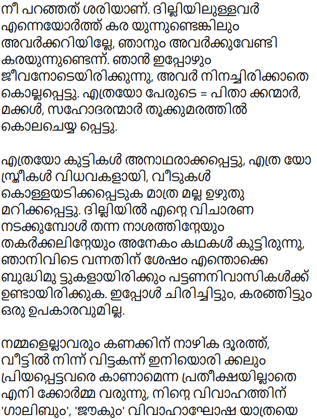 मैं ने उसे देखा। तुमने सच ही कहा था। बहुत जोशीला था। दर्शकों के मन में ज़रूर देशस्नेह उत्पन्न करेगा। ठीक है परीक्षा की इस समय ऐसी एक सी.डी.बहुत खुशी प्रदान करती हैं। कितने महानों का जान हमारे लिए नष्ट हो गया हैं?